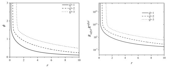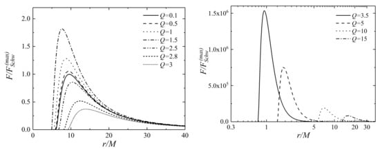 where is the metric’s determinant in the equatorial plane and is the mass accretion rate that is assumed to be constant. Specific particle energy, momentum, and angular velocity are defined from (29). We obtained the radiation flux for several values Q in presence/absence of inner stable ring of AD. The corresponding fluxes are shown in Figure 10. To compare different types, we normalize them to the maximum flux in the case of a Schwarzschild black hole . We see that the maximum value of different types can be less or more then 1 as distinct from the case of the massless scalar field [,], where due to .