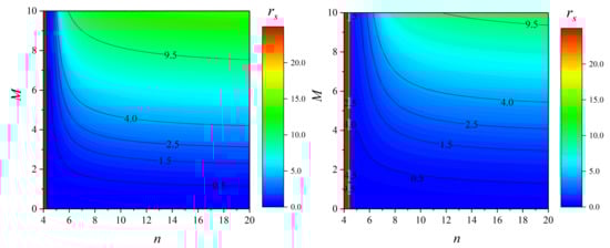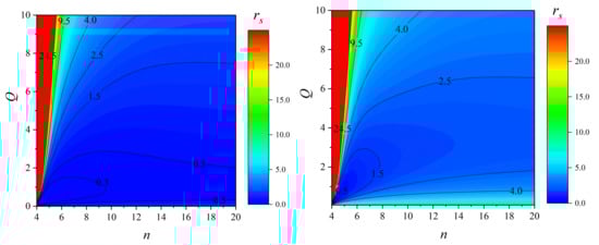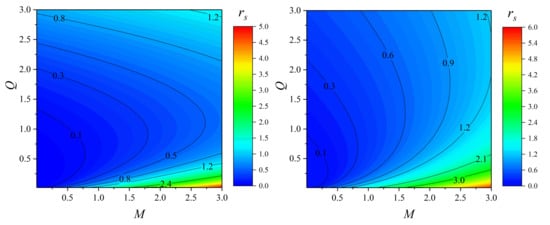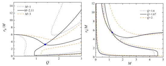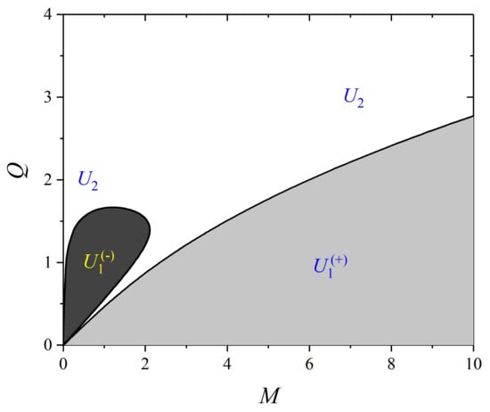 Using Equation (28), we numerically get the bifurcation values and under conditions that and . This allows us to determine SCOD types for given configuration parameters. Figure 8 shows the corresponding results in the plane. Also, Figure 9 illustrates the dependence of the boundary radii (i.e., radii of the blue circles in Figure 6) upon M and Q.