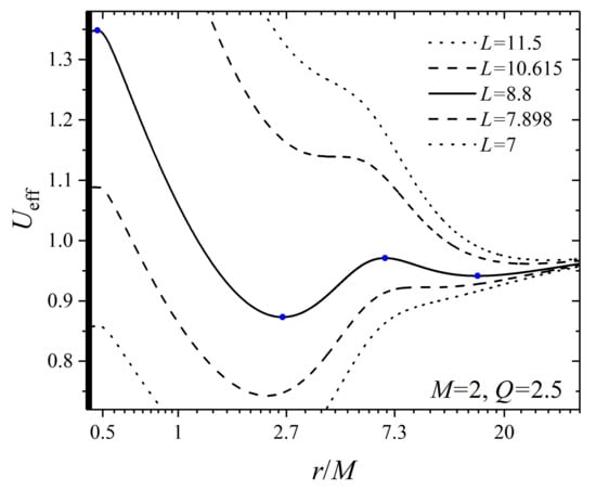 We use a method of our works [,] to study bifurcations associated with the appearance and disappearance of the minima of . Figure 7 illustrates how the shape of the effective potential changes with an increase in L in case of the SCOD type. Essentially this is connected with investigation of joint conditions and , which allow us to exclude L; this leads to a necessary condition , where