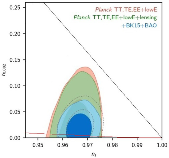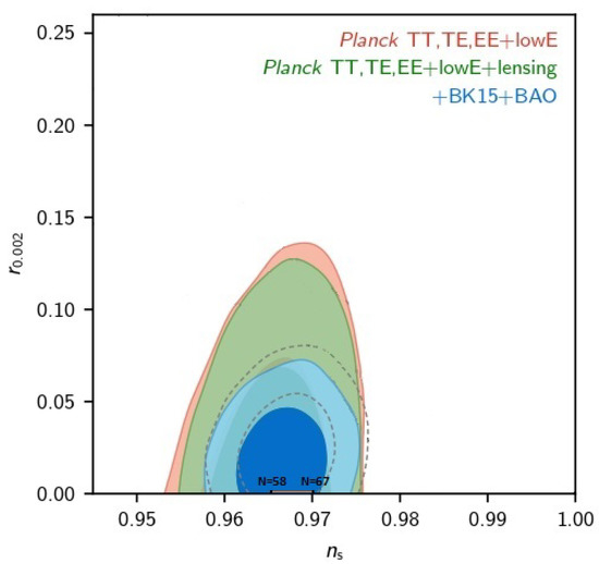 Unfortunately, the original Peebles–Vilenkin model provides a spectral index and a tensor/scalar ratio that do not enter in the two dimensional marginalized joint confidence contour at CL for the Planck TT, TE, EE + low E+ lensing + BK14 + BAO likelihood (see Figure 1).