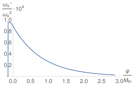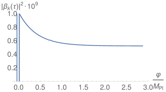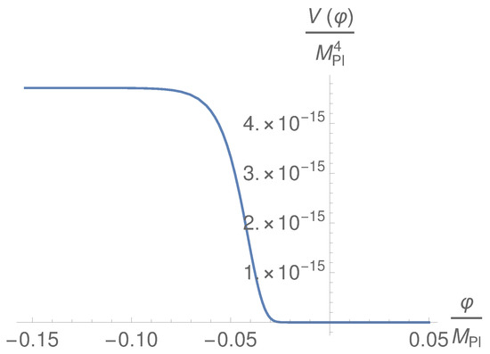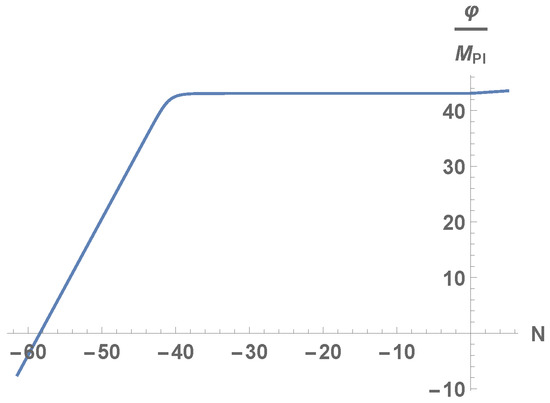 The calculation of the other parameter is more involved, and for that one needs to know the evolution of the inflaton field up to the present time. As we will see, the value of the inflaton at the present time is in the order of (see Figure 1). Thus, taking into account that in order to reproduce the current cosmic acceleration, the kinetic energy has to be negligible compared with the potential one at the present time, in order to match with the present energy density we will have