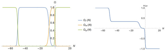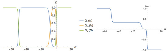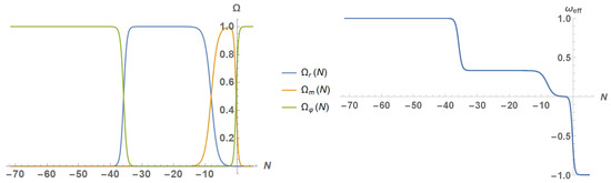 (Left): The density parameters (orange curve), (blue curve) and , from kination to future times. (Right): The effective equation of state parameter , from kination to future times. As one can see in the picture, after kination the universe entered into a large period of time where radiation dominated. Then, after the matter–radiation equality, the universe became matter-dominated, and finally, near the present, it entered into a new accelerated phase where approaches .