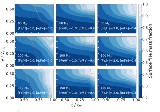 Figure 1 shows the surface He mass fraction contours as a function of time and for a range of mass and metallicity. We notice that all masses show WNL features with surface He mass fraction ≳ quite early on the MS, , if they are moderately or rapidly rotating with irrespective of metallicity. This value of is also supported by the theory of massive star formation [83]. Therefore, we use as our fiducial case. At solar metallicity, stars show surface enhancement of He when they have lost ≲ of their initial masses on the MS irrespective of rotation rate. However, at low metallicities, [Fe/H] , we see the surface He enrichment only for . In these metal-poor moderately or rapidly rotating stars, the rotational mixing of chemical elements dredges up the heavy nucleosynthetic by-products from the core to the surface, even though weak mass loss does not strip off much of their outer layers.