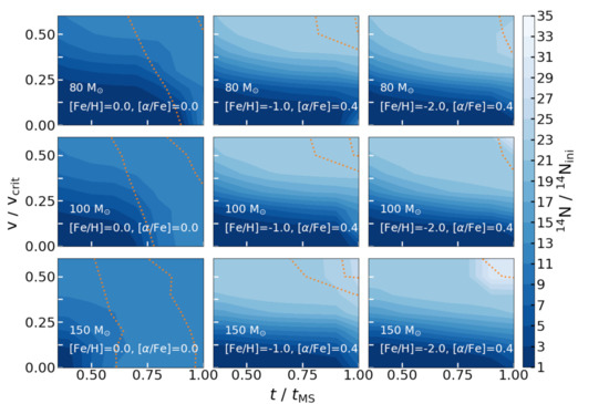 Same as Figure 1, except for the N color contour denoting the N mass-fraction compared to the initial N (N) abundance. N are , , and , respectively, for [Fe/H] , , , respectively. For details, see the discussion of Figure 2 of [4].