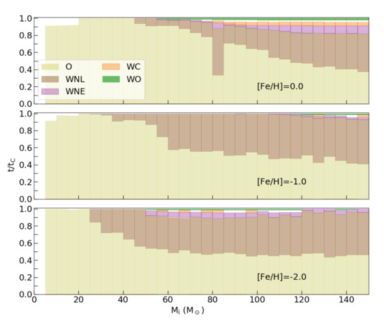 The fraction of time each star with a specific intial mass (horizontal-axis) spends in a particular phase classified as O, WNL, WNE, WC, WO, until we stop our simulations at the end of core C exhaustion (), similar to Figure 1 of [5]. These different phases of massive stars are shown by different colors indicated in the figure legend. The definitions for these claasifications of different phases are given in Table 1. Models shown here are for our fiducial rotation rate, , and the three panels refer to three metallicities, as indicated.