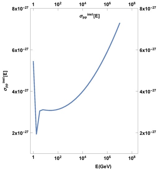 where = 1.2 GeV and L = ln(E/1000 GeV)) (see in [6,17]). Equation (3) is justified if we consider a small cube of matter of number density n, moving at speed (near) c and having a surface A perpendicular to its direction of motion. Then, n × c has the dimensions of cm× s. This is then multiplied by , resulting in the inverse time scale for the aforementioned p–p collision. In Figure 1, is plotted.