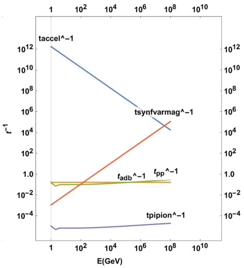 High-energy proton distribution loss time scales, for various processes in the jets, plotted with energy in GeV. t is the proton acceleration time scale at shocks. t stands for the synchrotron mechanism loss time scale, using a magnetic field that varies from point to point within the jet. t is the adiabatic loss time scale, t is the (hot–cold) proton–proton collision timescale. t stands for the pion decay timescale t.