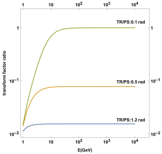 Ratio of high-energy proton distribution density transformation as calculated by the formulae of TR and PS, respectively, for three different angles. TR stands for [32], PS for [33]. A reproduction, for verification, of a figure from in [32].
