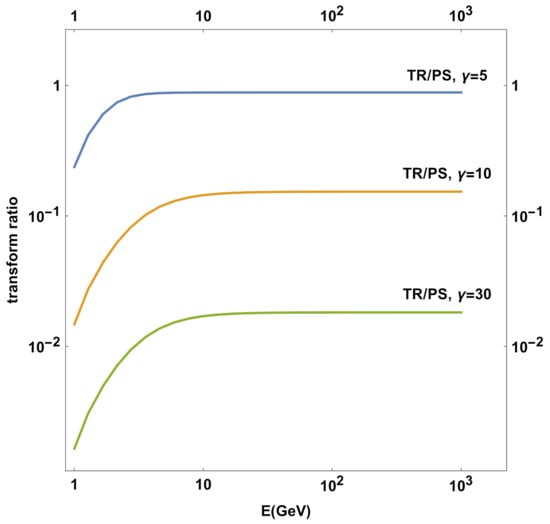 Ratio of the results of TR and PS of TR/PS non-thermal proton distribution density transformation factors for three different Lorentz factors. TR stands for [32], PS for [33]. A reproduction, for verification, of a figure from in [32].