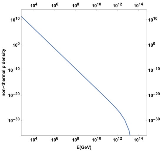 Following the works in [6,9,17], certain energy loss mechanisms are included. This presentation is performed in a cell with the properties of () = (−0.3780c, 0.4480c, 0.0124c, 10 G, 10 G, 10 G, 2.1 × 10 cm, 1.047 rad, 5.00 × 10 rad, 2.0). In the latter, u stands for velocity and b for magnetic field along directions x, y, or z. Bulk flow proton density is denoted by n, and ( = 0) is the complementary to , the angle to the line of sight. Last, is the high-energy proton distribution spectral index. As an exception, the pion injection function presentation uses a different velocity vector of (0.2, 0.8, 0.1)c. Nevertheless, in the model runs, these are potentially performed in every cell.