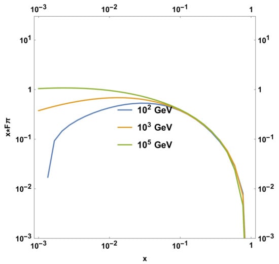 F function, Equation (17), F function, corresponding to the pion spectrum emerging from a single (hot–cold) proton collision, multiplied by the x = fraction. Calculation performed at three different energies for the non-thermal proton.