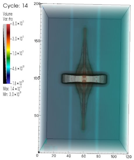 In all of the model runs, the same initial jet density of 10 protons/cm was used (a typical value for the inner microquasar jet, also compatible with the energetics of the jet and its kinetic luminosity), 2000 times less than the maximal surrounding gas density (i.e., a light jet is assumed, which is a possibility that supports a rich jet–wind interaction environment, but is also more demanding from a computational point of view). Winds comprise an accretion disk wind construct and a stellar wind that falls off away from the companion star, located off-grid at (4 × 10 cm, 1 × 10 cm, 4 × 10 cm), while the jet is threaded by a strong confining toroidal magnetic field of B = 10 G, assuming equipartition between kinetic and magnetic energy density (see Appendix B for the calculation of the latter equipartition value for B, in relation to the jet kinetic luminosity). A guide for inner system winds and their densities was SS433 [15]. Simulations were run until t = 842 s, saving a data snapshot every 25 (simulation) s. A three-dimensional snapshot of density is shown in Figure 9, where we can see the magnetically collimated jet pair advancing through surrounding winds.