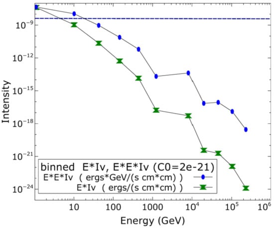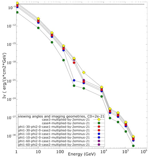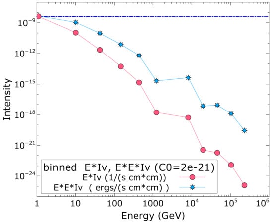 For our case, we find ≃ 2 , which is the value of the arbitrary unit . Using the above constant, we multiply by it the value given in arbitrary units for the particle emission. Thus, the intensity plot is multiplied, and we arrive to the updated plot in Figure 10, which may be directly compared to other models and to observations.