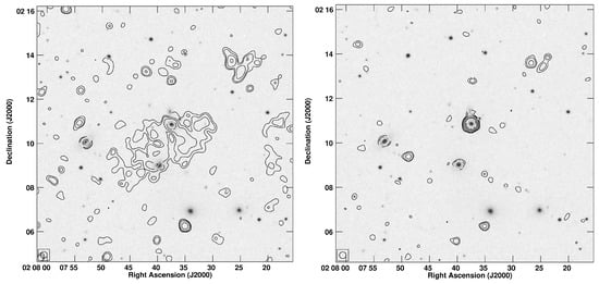 Figure 2 shows the aforementioned HCG 15. Observations at two different frequencies are presented: one at 618 MHz and one at 4860 MHz. The difference is striking: while the reprocessed low-frequency data of Giacintucci et al. [] show a large pool of extended radio emission, covering some of the group members, with a global maximum associated with the northernmost galaxy, those gathered at the higher frequency reveal nothing but the point-like radio galaxy. Contrary to the example of HCG 60 (Figure 1), neither radio jets nor lobes are present, suggesting that the system’s envelope is indeed a genuine intergalactic structure. Albeit HCG 15 is a bit atypical for a fossil, as its continuum radio emission can be detected at least as high as 1.4 GHz Nikiel-Wroczynski et al. [], it is only possible to identify and examine the small-scale structures when low-frequency data are used. Being a group of the northern sky, HCG 15 will finally be included in the LoTSS and LoLSS data. This will allow for performing a detailed study of a fossil’s magnetic field for the first time.