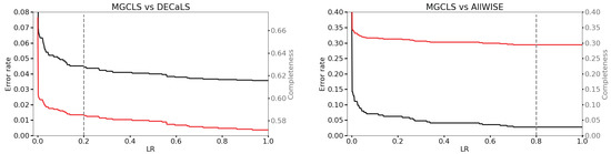 Cross-matching error rate (black) and completeness (red) versus LR. (Left): MGCLS–DECaLS cross-match results. The vertical dashed line indicates the optimal threshold LR > 0.2. (Right): MGCLS–AllWISE cross-match results where the vertical dashed line indicates the optimal LR cutoff of 0.8.