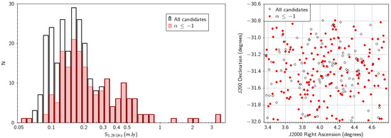 As a final step, we manually checked the 340 () candidates against the NASA/IPAC Extragalactic Database (NED; [51]) to look for any redshift information or whether a source exists in other optical/IR catalogues. We used an NED search radius of 4″. Six of the HzRG candidates had available redshift information, five of which had and were therefore discarded from the candidate list. The sixth source, MKTCS J001802.40−313505.5, was confirmed as a high-redshift galaxy at (H-ATLAS J001802.2−3135005; [52]). An additional 60 sources had NED cross-matches from other optical/IR catalogues and were discarded as candidates. Finally, we used Vizier [53] to cross-match against the Million Quasars catalogue (v7.2, [54])—we found no matches within 4″ of our candidates. Our final HzRG candidate list contained a total of 274 sources: 179 USS sources and 95 potential HzRG candidates with no spectral index information.
