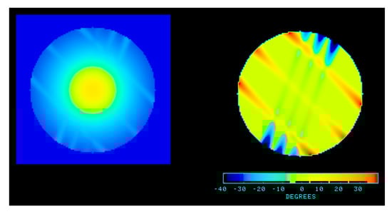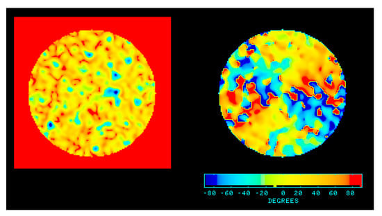 Our second example illustrates the power of polarization tomography to see subtle gradients in polarization angle as a function of position, by converting the changes into a time sequence, which is often easier to recognize. We take all of the S() images and visualize them as a movie. In this model, we add a polarized signal of constant amplitude and variable polarization position angle = , where a is the azimuthal angle. Random noise is then added with an rms amplitude equal to the polarized intensity. The resulting polarized intensity and polarization angle images are shown in Figure 3. At a signal-to-noise ratio of 1, the polarization angle map appears to have an azimuthal dependence, although an observer might express caution with that conclusion. The movie of S() frames, Figure S1 (please see Supplementary Materials), makes the azimuthal dependence very clear.