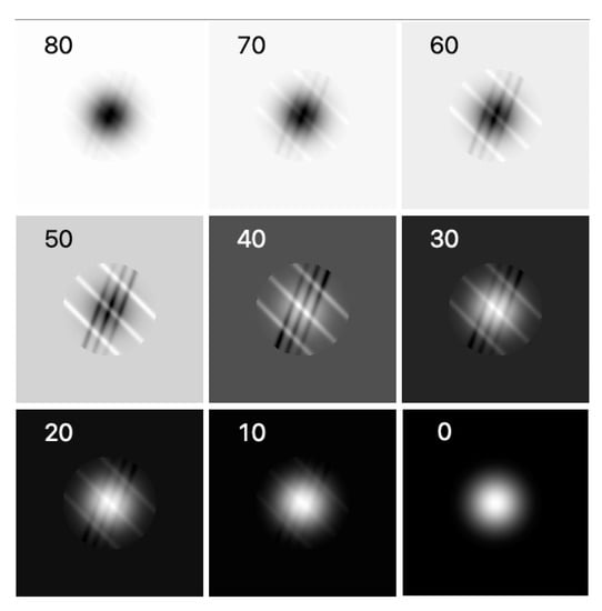 Frames are each images of the simple model of multi-component polarized emission, as described in the text. The corresponding value of listed in the upper left. The greyscale is automatically set to cover the range in each frame, from black = minimum to white = maximum. can be either positive or negative; the background in each frame is at zero intensity.