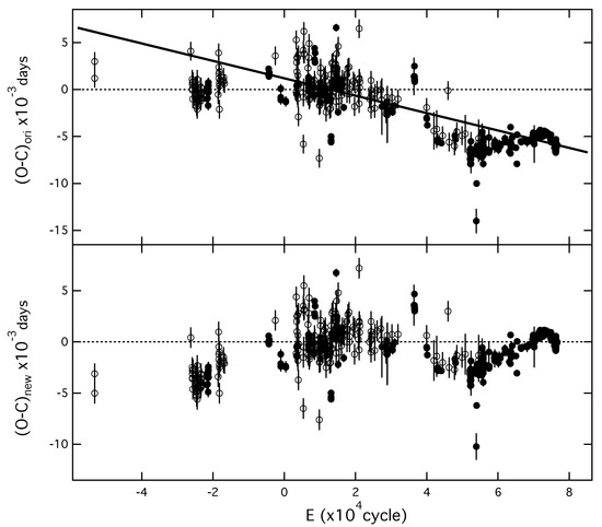 Since the previous O-C analyses (e.g., [14,20]) never carried out a detailed verification for all datapoints, but only made the collections for the historical light minimum times available in the literature, a possibility that the data points with the large deviations (many were clearly seen in the historical O-C diagrams) resulted from the incorrect light minimum times, cannot be ruled out. A cross-identification for all the light minimum times from the literature found that some with the small differences are caused by the different observatories and filters, while some listed in O-C gateway [25] are different from the data published in the literature. The averages and primary data were preferred in these two cases, respectively. Finally, 28 revised light minimum times are listed in Table A2 of Appendix A. They are helpful for clarifying the authentic variations in eclipsing times. Considering that most of the precisions of CCD light minimum times are 4 significant digits, we inferred that the previous photoelectric/CCD eclipsing times lack of the errors also have similar precisions (i.e., 0.0001).