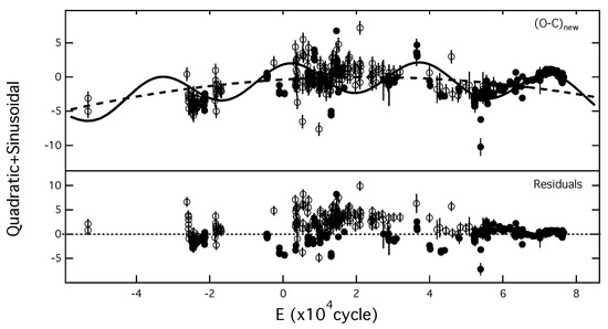 where , e, , , M, EE, , , and t are semi-amplitude, eccentricity, longitude of periastron, true anomaly, mean anomaly, eccentric anomaly, time of periastron passage, orbital period of the third body, and light minimum times, respectively. To carry out the non-linear least-squares fittings, we used our routine, OCFIT, combining a Levenberg–Marquadt algorithm with an improved Nelder–Mead simplex method [28], which was successfully applied to the non-linear fittings for the complicate O-C variations of the polar AM Her [29].