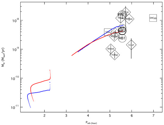 Mass transfer rates as a function of the orbital period. The red and blue lines refer to the mass transfer rates derived by the standard and revised models [42], respectively. The CV names represent the CVs with the orbital periods similar to that of RW Tri listed in Table 3. The texts of MT, MB1, and MB2 inside the open circles represent , and of RW Tri calculated in this paper, respectively. The mass transfer rates denoted by the diamonds are listed in Table A.2 in Dubus et al. [44], while those denoted by the rectangles are derived from their corresponding O-C diagrams.