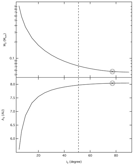 Masses and separations of the third component in RW Tri depending on the different orbital inclination are plotted in the upper and lower panels, respectively. The cross denotes the mass and separation of a brown dwarf hidden in a coplanar orbit of RW Tri.