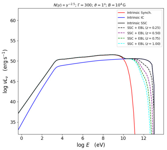 Spectral energy distribution expected for a relativistic blob of plasma, with bulk Lorentz factor , moving with an inclination of from the line of sight and carrying a magnetic field G. The radiating particles are assumed to be electron-positron pairs in a power-law distribution , with . The red line represents synchrotron emission, while the blue line shows the inverse Compton scattering contribution. The resulting spectrum is represented as a continuous black line. The dashed curves illustrate the effects of -opacity on the Universe background radiation for redshifts , in steps of 0.25.