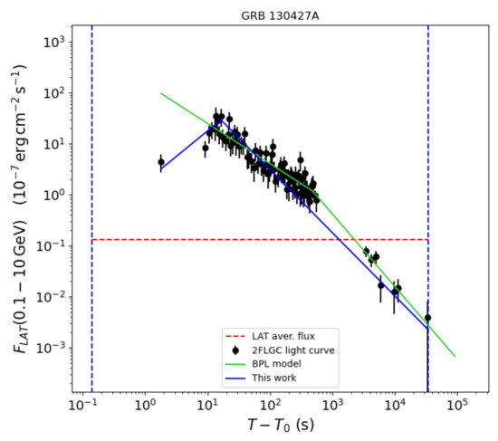 Comparison between the Fermi-LAT light curve of GRB 130427A and the model based on Equations (4) and (5). The vertical blue dashed lines mark the temporal window of the LAT signal, the red horizontal line is the average energy flux collected during the emission, the green continuous line is the 2FLGC broken power-law fit to the data, while the blue continuous line is a model using the light curve of Equation (5).