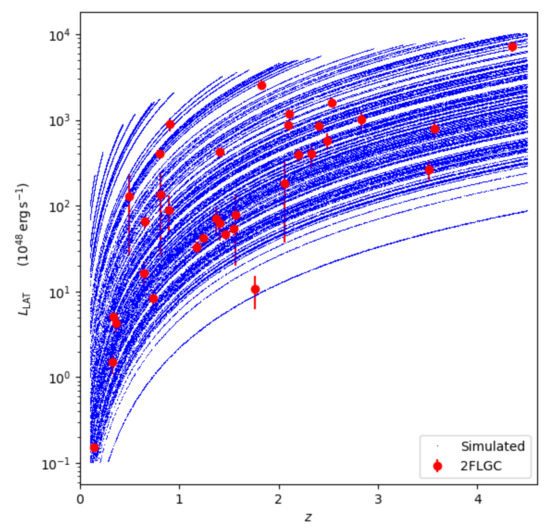 The approach that we adopted in our simulations was to extract the fluences of all the LAT detected GRBs, reported in 2FLGC, and to assign a set of 1000 random redshift values to each GRB without an available redshift measurement. The result of this process is the production of 1000 random GRB redshift distributions, corresponding to an equal number of random luminosity distributions, all of which yield the observed 2FLGC population. As shown in Figure 3, the simulation set provides a distribution of GRB luminosities which is in good agreement with the one followed by the 2FLGC GRBs with a measured redshift. The combination of all the different simulations, therefore, can be used to estimate the likelihood that a GRB with measured spectral and temporal characteristics is associated with a specific redshift range (see [46] for more details on the simulation process).