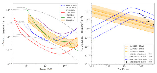- La Mura, G.; Barres de Almeida, U.; Conceição, R.; De Angelis, A.; Longo, F.; Pimenta, M.; Prandini, E.; Ruiz-Velasco, E.; Tomé, B. Gamma-ray burst detection prospects for next generation ground-based VHE facilities. Mon. Not. R. Astron. Soc. 2021, 508, 671–679. [Google Scholar] [CrossRef]