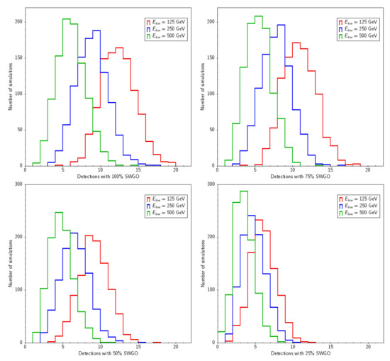To test the potential role of SWGO as a monitoring and alert system, we took the sample of GRBs with simulated redshifts, discussed in §3, and we calculated the expected VHE fluxes, integrating Equation (4), with the inclusion of Equation (5), in time and in energy, using the spectral and the temporal characteristics extracted from 2FLGC and applying the absorption effects predicted by an EBL opacity model [39]. The results of these calculations are summarized in Figure 5 for different possible performances of the experiment. The plots shown in Figure 5 represent the number of simulated redshift distributions that result in the GRB detections reported on the x-axes out of a total of 1000 simulations. Although we observe that all the explored configurations have some degree of detection chances, we can easily verify that an instrument performing at the optimal sensitivity, down to a low energy threshold of GeV, has a predicted ability to detect significantly more than 10 GRBs in 10 years in approximately 75% of the simulated scenarios, provided that they occur within a zenith distance of . Adopting lower performance solutions, or using a spectral window with a higher limiting threshold, such as 250 GeV or 500 GeV, leads to lower detection chances, due to the loss of many relatively low-flux events and to a more severe effect of EBL opacity, which limits the visible horizon to a smaller volume of the Universe. Incidentally, these calculations approximately correspond to what we would expect at larger zenith distances and, therefore, within increasing fractions of the available FoV, from an optimally performing solution. As a result, even if the FoV covered by a ground-based instrument below 1 TeV is smaller than the one that was available in the case of the Fermi-LAT observations, by taking into account the estimated distribution of expected GRB fluxes, we can conclude that the possibility to detect more than 1 event per year is a reasonable expectation. Due to the characteristic shapes of the tested light-curves, which are generally dominated by the peak flux, a fraction of approximately of these detections is estimated to occur within the first 10 s of the event, resulting in promisingly good chances to investigate the elusive properties of the prompt emission.