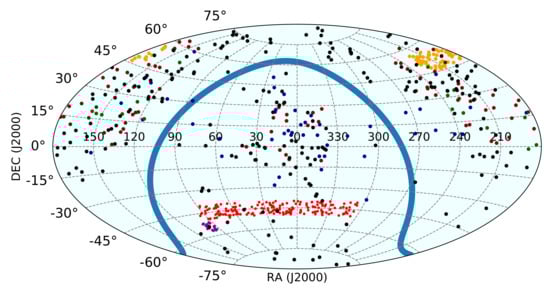 - Mauch, T.; Murphy, T.; Buttery, H.J.; Curran, J.; Hunstead, R.W.; Piestrzynski, B.; Robertson, J.G.; Sadler, E.M. SUMSS: A wide-field radio imaging survey of the southern sky-II. The source catalogue. Mon. Not. R. Astron. Soc. 2003, 342, 1117–1130. [Google Scholar] [CrossRef]