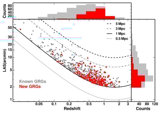 - Kuźmicz, A.; Jamrozy, M.; Bronarska, K.; Janda-Boczar, K.; Saikia, D.J. An Updated Catalog of Giant Radio Sources. Astrophys. J. Suppl. 2018, 238, 9. [Google Scholar] [CrossRef]