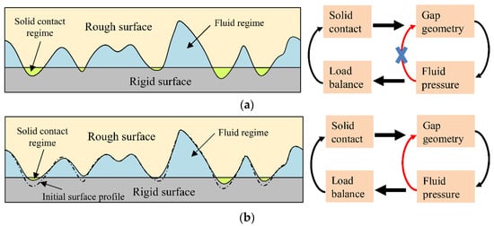 The model proposed above involves the interaction between asperities and the micro-EHL effect at the asperity scale. In order to further illustrate the influence of the micro-EHL effect, a schematic diagram comparing models with and without the micro-EHL effect is shown in Figure 1. Figure 1a shows the geometry of the lubricated surfaces without the micro-EHL effect, which is only determined by the dry contact of rough surfaces. In Figure 1b, the lubricating gap is also influenced by fluid pressure, showing the micro-EHL effect.