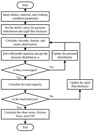 The numerical procedures used to solve the parallel contact problem formulated in the previous section are also based on the ideas proposed by Zhu and Hu [,]. The current study extends these conventional methods to parallel rough surfaces. The corresponding calculation flow chart is shown in Figure 2. The inner loop is designed to solve the pressure distribution, p, iteratively. Once the difference between the two adjacent iterations of pressure distribution is smaller than a predefined tolerance, the pressure distribution converges to the true solution. After the pressure distribution is obtained, the load-carrying capacity is calculated. The load balance equation, Equation (5), is then checked. When Equation (5) is fulfilled, friction forces, COF, and other parameters can be calculated. Otherwise, the rigid film thickness is updated, and the simulation goes back to the inner loop and runs again until Equation (5) is satisfied. The detailed equations for these numerical procedures are provided in Supplementary Material S1. It should be noted that, as the steady-state Reynolds equation, Equation (1), is used, there is no time step loop in Figure 2.