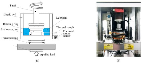 Tribologcial tests were conducted on a standard commercial tribometer (PLINT TE92, Phoenix Tribology, Kingsclere, UK). Figure 3 shows the schematic diagram of the tribometer and a picture of the tribometer. The rotating ring is fixed in the drive shaft, while the stationary ring is assembled at the bottom of the lubricant pool. Between the rotating ring and the drive shaft, there is a self-alignment joint to compensate for manufacturing and assembly errors, by which the parallelism between the rotating and stationary ring surfaces is maintained to a certain extent. The loading cell applies a normal load from the bottom, and the friction force is measured by the frictional torque sensor. A thermocouple records the temperature near the tribological surfaces.