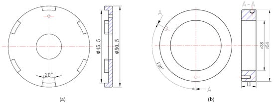 The structure of rotating and stationary rings is shown in Figure 4. The contact area is reduced by utilizing a specially designed rotating ring structure. The heat generated during the experiments remains under control with smaller contact areas. Thus, the lubricant viscosity and density can be assumed irrelevant to the temperature during the experiments, which is compatible with the proposed isothermal lubrication model. The heat control performance of this designed structure is validated, and the corresponding results are shown in Section 3.3.