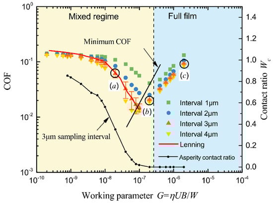 It can be readily seen from Figure 5 that the different sampling interval values used to simulate the rough surfaces significantly influenced the simulated COF. It should be considered that a larger sampling interval here represents a larger and smoother surface. As the sampling interval value increased, the decrease of COF became quicker (steeper fall in COF) in the mixed lubrication regime. The predicted minimum COF value also decreased and corresponded to smaller G values for larger sampling intervals. These results show that larger and smoother rough surfaces can enhance the mixed lubrication performance between parallel rough surfaces within the parameters studied in the current work. Moreover, as changing the sampling interval did not represent resampling a specific rough surface, the simulated COFs with the different sampling intervals did not converge to the same curve. Furthermore, an interesting point to observe is that, in the full film lubrication regime, the influence of the sampling interval value on the simulated COF was relatively small and became negligible as the sampling interval value increased. These results show that the rough surface size and smoothness have fewer influences on the lubrication performance within the full film regime.