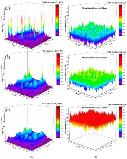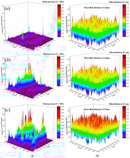 Figure 8 shows the pressure and film thickness distributions at three working conditions (a, b, and c), with the same G values as those a, b, and c points marked in Figure 5. The corresponding mean film thickness values were 0.43 μm, 0.44 μm, and 0.57 μm, respectively. In comparison, the mean film thickness values shown in Figure 6B were 0.34 μm, 0.57 μm, and 1.26 μm, respectively. Thus, when the micro-EHL effect was not involved, the increase of the mean film thickness was much slower as the G increases. Such results further illustrate the importance of the micro-EHL effect in the lifting-off of parallel rough surfaces.