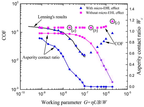 Figure 7 shows the simulated COF curves and contact ratio curves with and without the micro-EHL effect. It can be readily seen that the simulation results without the micro-EHL effect could not predict the experimentally measured COF values. Moreover, as the G increased, the differences between simulated COFs with and without the micro-EHL effect first increased then decreased. The difference between the simulations with and without the micro-EHL effect is shown in Figure 1. With the micro-EHL effect, the gap geometry was determined by the combined effects of the fluid pressure and asperity contacts. In comparison, the gap geometry was only determined by the asperity contacts without the micro-EHL effect.