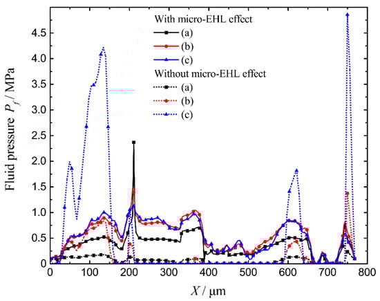 Furthermore, the central lines of the pressure distributions of the three working conditions shown in Figure 6A or Figure 8A were plotted in Figure 9. Whether the micro-EHL effect was considered or not, the pressure values increased as the G increases from point (a) to (c). A few significant pressure bumps were generated when the micro-EHL effect was not included. At other positions along the central line, the pressure values equaled the cavitation pressure. However, hydrodynamic pressure was generated at almost every central line position when the micro-EHL effect was considered. In other words, the micro-EHL effect reduced the cavitation area. These results directly indicate that the micro-EHL effect plays a significant role in generating hydrodynamic pressure between two parallel rough surfaces. One point that should be noted is that, even within the full film regime and working condition (c), the micro-EHL effects still existed and significantly influenced the fluid pressure distribution. Such results explain why the COFs with and without micro-EHL effects, shown in Figure 7, still have significant differences when the simulation with micro-EHL effects enters the full film regime. Another interesting point in Figure 9 is that the fluid pressure without the micro-EHL effect became far higher than that with the micro-EHL effect at some positions as the G increased from point (a) to point (c). This phenomenon was also due to the coupling effects between fluid pressure and surface deformation. When the effects of fluid pressure on surface deformation were not considered (without the micro-EHL effect), sharp fluid pressure peaks existed, indicating the gap geometry was steep at those positions. In contrast, the micro-EHL effect could flatten those steep geometries, eliminating corresponding sharp fluid pressure peaks. Therefore, the fluid pressure generated by the steep gap geometry (without the micro-EHL effect) could be higher than that generated by the flattened gap geometry (with the micro-EHL effect) when the G value is large enough.