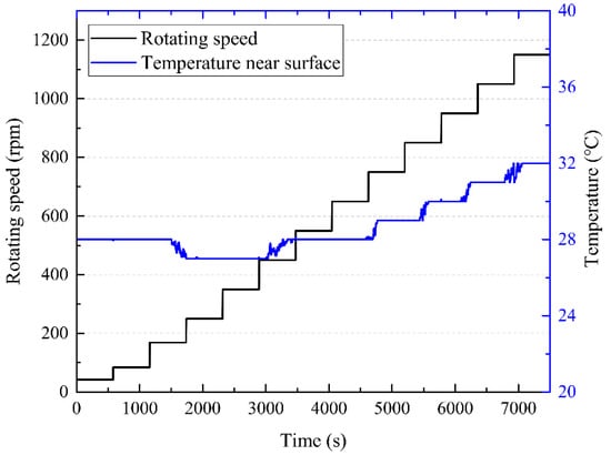 In order to further establish the validity of the findings from the current study, a thorough new experimental study was performed. The working parameters were chosen as follows: applied load equals 100 N, rotating speed increases from 42 r/min to 1150 r/min in a stepwise manner, and then the system runs for 6 min at each speed. The applied load was kept constant during the process of varying the rotating speed.