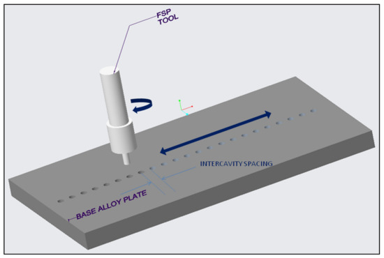 The reinforcing particles are preplaced over the surface of the base alloy using the surface blind holes technique as shown in Figure 1. Using hand compaction, the reinforcing powder was compacted into the surface blind holes. To guarantee optimal distribution throughout the FSP process, the reinforcement powder mixture must completely fill the hole. Here are the specifications of the procedure: The alloy plate was then fastened over the machine table utilizing fixtures configurations. The tool for capping H13 steel that excludes pins has been used. The tool holder on the rotatable spindle must be secured with the capping tool inside. All composites have undergone capping passes at w-1000 rpm, v-30 mm/min, and 0.3 mm of tool plunge depth. Following capping, the cavities fully packed with reinforcements inside have been sealed with a thin layer of the base alloy.