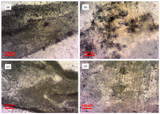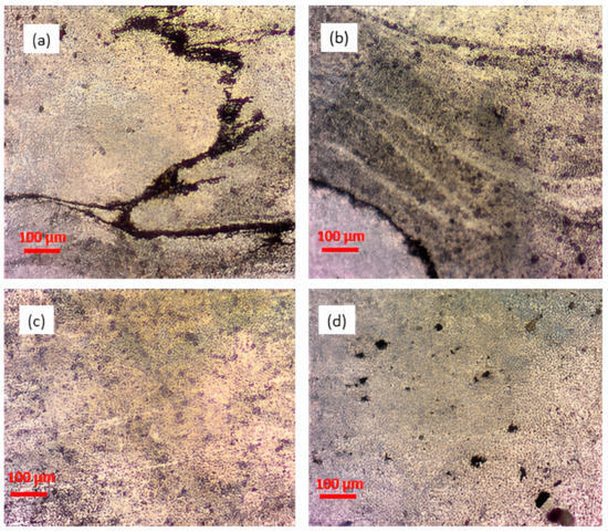 The micrographs obtained are observed carefully to understand the SiC/Gr nanoparticles’ distribution, the movement of particles with plasticized metal during the processing, and the dispersion regions with low, medium, and highly dense SiC/Gr particles presence. The morphology of the AA7075-SiC-graphite composites has been shown in Figure 2. The onion rings on the surface composites are observed. Three composite bands were produced for every run of L27 combinations. The wear sample was cut from the middle of the band as shown in Figure 2. The Figure 3 and Figure 4 show the optical imaging micrographs of run S-10 and run S-24 surface composite’s stir zone region. From the optical micrographs, it is observed that the SiC/Gr nanoparticles’ distribution inside the stir zone is governed by the resultant plasticized material movement during processing. Thus, bands with various particle presences are seen in the SZ areas. For S-10 composite, Figure 3a denotes the SiC-Gr particles moderate agglomeration in reverse s-shape area, and in other regions, it looks well distributed. Similarly, the SiC/Gr particles’ distribution looks good and homogenous, as presented in Figure 3b–d. The S-10 composite band has been produced for the volume percentage of 4% and with the speed of 1500 rpm. Due to the high rotating speed, the SiC/Gr particles are now mainly uniformly spread with a few small dense clusters. The re-fined equiaxial fine grains’ structure is a result of the grain size refinement, which was caused by the uniform distribution of SiC/Gr particles.