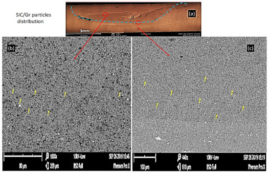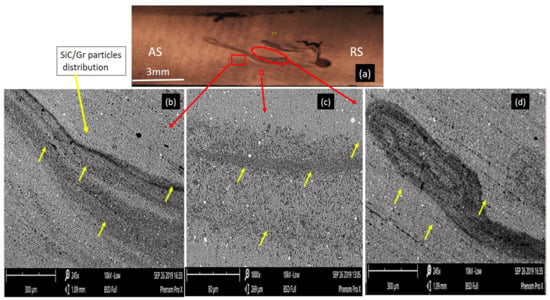 For the S-10 composite, the SEM micrographs are shown in Figure 6, where the particle distribution within the band stir zone is observed. The macrograph of the processed zone depicts that the SiC/Gr reinforcement particles have distributed comparatively well in comparison to the S-24 composite. Only at the AS bottom, the small agglomerates are observed. On the retreating side, the particles agglomerations have not been regarded as like the S-24. The stirring action in the case of run S-10 was found to be intense enough to overcome the aluminum base alloy’s flow stress and smoothened the particles’ dispersion within the plasticized zones. Different areas on the bands have been observed using SEM, as shown in Figure 5 and Figure 6, respectively. The yellow arrows indicate the SiC/Gr particles’ dispersion agglomerates and continuous bands.