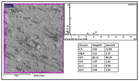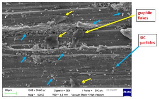 The SEM EDX analysis shows that the higher Fe content is observed to be 37%, the carbon C-29%, silicon Si- 16.4%, and a small amount of Al-8%. Here, the critical point is that a higher content of SiC and graphite particles have been pulled out during abrasion due to the reinforcement’s high-volume percentage. Thus, these reinforcements have initially resisted the wear of the pin. Still, when the repetitive loading continued, the loose interfaces led to the particles pull-out instead of optimizing the firm shaped load-bearing asperities. The initial platelets were generated during the resistance to the mating surface asperities. Then, continuous fine particulates from the pin have been dug out as interfacial bonding was not good. Thus, it is indicated that reinforcement’s uniform dispersion with suitable interfaces with matrix material is an essential requirement irrespective of the nature of the reinforcement to be utilized. The latter can be functionalized if the dispersion and interfaces with the α-phase aluminum matrix are good.