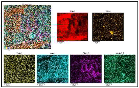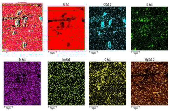 In both the composites of the S-10 and S-24, at the interface of the reinforced and unreinforced zones, the change in the microstructure has been observed. The reinforced zone indicates the presence of SiC hard particles with graphite nanosheets dispersed around and also the inherent insoluble constituent phases and soluble precipitates, whereas in the case of the unreinforced/particles free processed zone, the inherent isomorphous precipitates and insoluble constituent phases are present. The constituent phases are micron-sized s, and an oval shape can be observed more clearly compared to the isomorphous phases in nanoscales. The presence of SiC-graphite particles has been confirmed through EDS and mapping analysis as shown in Figure 7 and Figure 8, respectively.