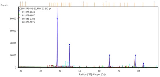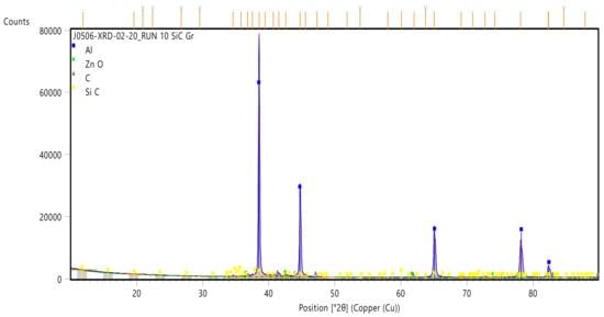 It’s confirmed that the S-10 composite surface contains SiC, Graphite, and ZnO inside the aluminum base alloy as shown in Figure 9. The base alloy Al shows peaks at 2θ = 8.46° with 100% match I% with [34]. The aluminum with cubic crystalline structure with indices (111) with an interlayer spacing of 2.3381 A° is observed, matching with the base alloy results. The rhombohedral crystal structure for SiC has been observed at a peak of 35.621°, d-spacing 2.5183 A° which matches 100% with the results from [35]. Many small peaks were present, indicating the SiC particles’ presence with different intensities, e.g., at 60.047° at 73 I%, 37.84° at 73.4 I%, 38.48° at 56.9 I%, etc. with the same rhombohedral crystal structure with different Miller indices.