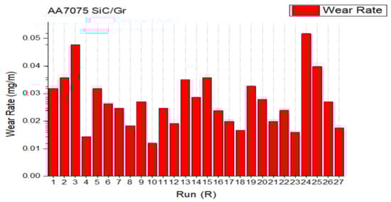The wear rate in mg/m for all of the L27 runs are represented in the bar graph as shown in Figure 11. The wear resistance has improved overall for the Al 7075-SiC/Gr samples compared to the base alloy. Under dry sliding circumstances, the wear rates of the surface composites were calculated using a Pin-on-Disc tribometer. The results of the wear are encouraging and have shown the significant effect of embedding the hard SiC and soft solid lubricant graphite nanoflakes on the surface behavior of the composites under dry sliding conditions, with this being different to the fretting wear behavior of the base alloy.