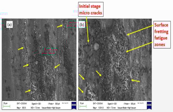 Figure 12 and Figure 13 show the wear tracks on the pins of base alloy AA7075-T6. The surface fatigue and resulting fretting wear taking place can be observed on the surface wear tracks. Mainly, the precipitates’ dense zones have been found to be prone for the fretting fatigue wear nucleation sites. From the images of the tracks, it can be observed that the dark black colors are the inherent isomorphous precipitates and the constituent phases zones, upon which repeated cycling loading among the asperities of the mating materials start showing symptoms of the fatigue micro cracks, which then subsequently convert into the crater area of the loose debris. The debris particles pulled out again have churned and acted as the abrasive medium between the mating materials, which led to the small abrasion lines. Along the parallel tracks of the dry sliding wear, tiny pits started to develop as a result of the adhesion caused by localized plastic flow, which was also seen on the surface. The adhesion and fretting fatigue wear were found to be prominent mechanisms responsible for the wear of the AA7075-T6 alloy samples.